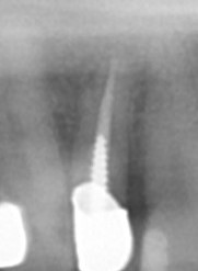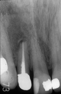 現状 唇側にフィステルを形成。動揺度も3度あり、まるで重度の歯周病に罹患しているような状態。グラグラしているのでこちらでは食事はできない。抜歯と言われても仕方がないと思われる。