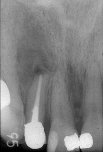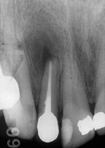 治療経過 まず保存治療を開始。セラミックの冠を撤去しメタルコアーも除去。前医が入れたガッタパーチャポイントを除去。かく電気的根管長測定器ルートZXとレントゲン写真を併用し正確な根管長を決定。正確な根管長に基づいて根管内の清掃消毒を行う。その後外科的根管治療を行い歯根のう胞を掻把、摘出。術中根充を行う。