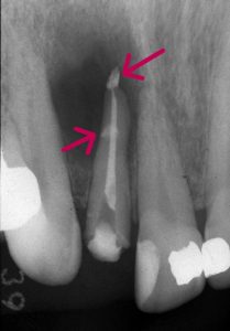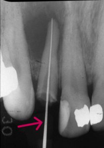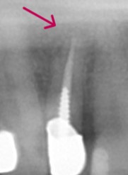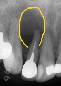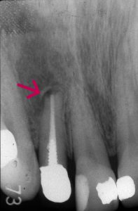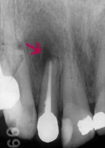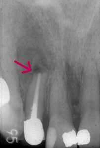 原因 根充剤のガッタパーチャポイントが根尖まで到達してしない。根尖に空間が出来ているので細菌感染を起こしている。