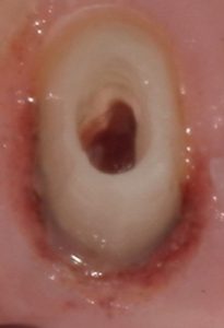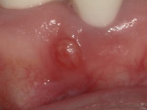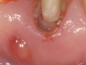 主訴 下の歯にセラミックの歯を入れたが一年前に腫れてきて、そのうちニキビのようなおできが出来た。セラミックの歯を外すと歯が割れてしまって抜歯になるから外さない方が良い、痛くないならおできはこのまま様子を観ましょうと言われた。