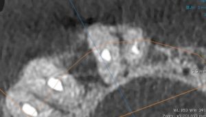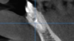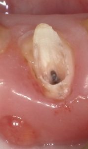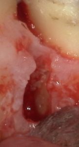 【外科的根管治療 頬側の骨がすでに吸収していて遠心側の歯根が露出している】