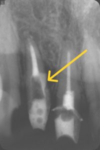 治療経過 セラミックを除去し土台も除去し、隔壁作成後ラバーダム下にて感染根管治療を開始。前医のガッタパーチャポイントを除去。