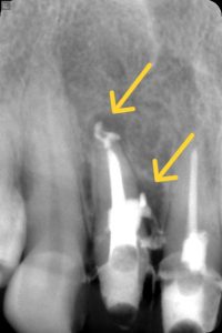 診断 根尖の病巣はガッタパーチャポイントが明らかにアンダーで空所が認められる。近心側は側枝の可能性、パーフォレーションの可能性がある。フィステルは根尖部ではなく歯頚部に近い部位にあるので近心側の方から由来している可能性がある。