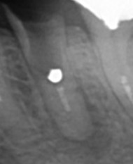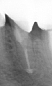 診断 ガッタパーチャポイントが根尖付近まで到達していないことから感染を起こしている。近心の異常に薄い根管壁はメタルコアーを除去する際にパーフォレーションを起こしている可能性がある。通法通り治療すれば治癒する。ただし歯肉縁下まで歯質が失われているので、根管治療が落ち着いたら臨床的歯冠延長手術は必要。