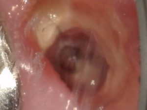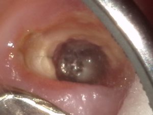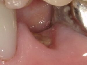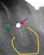 現状 左下5番が残根状態で根尖部が腫脹、自発痛を訴えている。根管内を肉眼で目視すると除去できなかったと思われるメタルコアーが残っているのが確認できる。