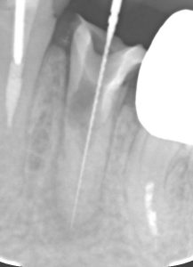 その後ガッタパーチャポイントも除去し、電気的根管長測定器とレントゲン写真を併用して根管長を測定。